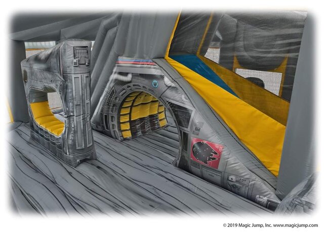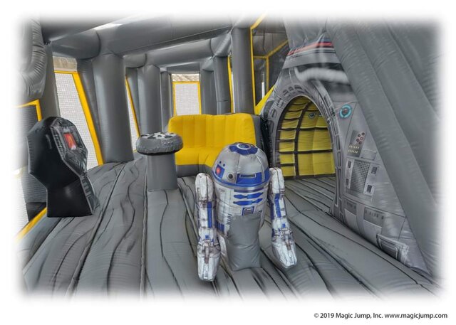 The Star Wars Millennium Falcon Inflatable Experience is the most unique inflatable attraction in the galaxy -- and it's unlike any playland, combo or obstacle course ever seen before. This is the inflatable version of the actual Millennium Falcon, the legendary spaceship made famous by Han Solo and Chewbacca. With beautiful exterior graphics all around and on top, you get the actual feeling of having the Millennium Falcon stationed in your residence or event. Go inside the inflatable to find your favorite features like the cockpit area, lounge area, holo-map, laser cannon turret and more! Some familiar characters in this piece include Chewbacca to welcome you as you enter, along with C-3PO and R2D2 inside. The Millennium Falcon experience features a HUGE bouncing area, 2 climbers and 2 slides, obstacles, popups, and more!