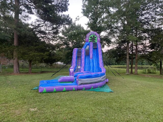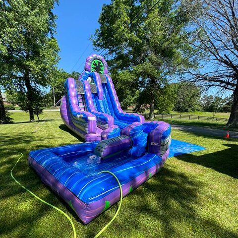 Make a splash with our 20ft Double Lane Purple & Ice Waterslide! 💜❄️💦