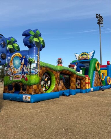 This 50-foot-long Sonic-themed obstacle course comes in two pieces for easy delivery and setup. It features Magic Jump’s special non-slip material for safe use with water. Piece #1 showcases Sonic and Tails at the entrance, welcoming players through a golden ring portal as the adventure begins. Inside, participants can bounce around before scaling the small dual lane climber and sliding down to face a zone filled with villainous surprises, including inflatable pop ups of Dr. Eggman and Metal Sonic. Players will have to defeat these foes before continuing their journey through Green Hill Zone. As they reach the second piece, Sonic appears with a big thumbs up to celebrate their progress and cheer them on toward the next challenge. Piece #2 features a tall climber and dual lane slide equipped with a water misting system that sprays players as they zoom down into the U shaped splash zone. The exterior showcases bright digital artwork that brings Sonic’s world to life with colorful landscapes, gold rings and Green Hill Zone's signature checkerboard terrain.